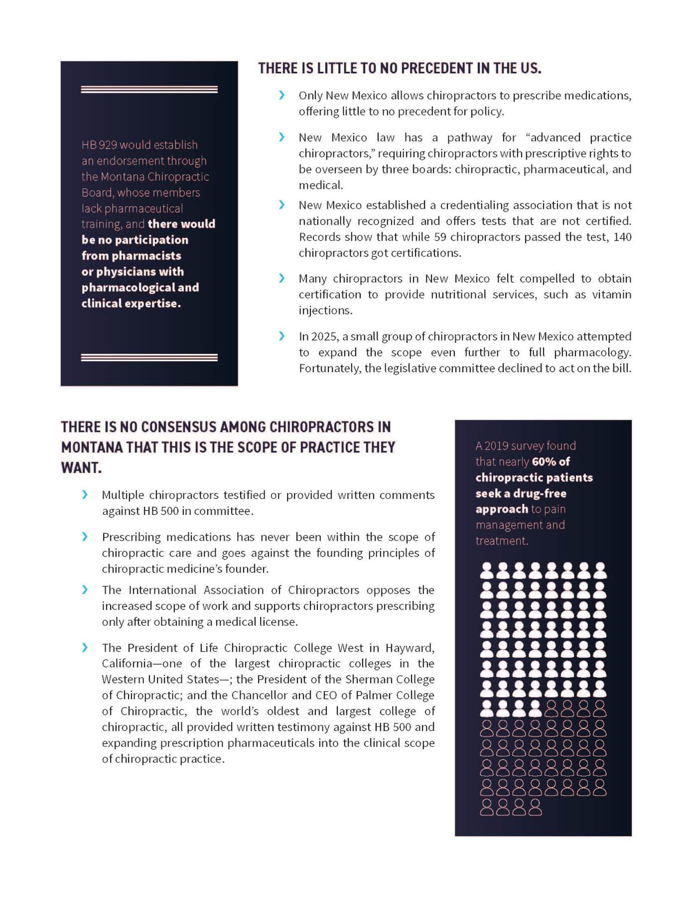 The ICA is concerned that the very language of the bill, most specifically provision lines 18-19 of page one, “ WHEREAS, there is widespread support from many health care providers in Montana to allow for doctors of chiropractic to have prescriptive authority;” has misrepresented the facts. It is our understanding that there is significant opposition by both the medical and pharmacy associations in Montana to this bill. (See Attached Fact Sheet) Further, the American Medical Association has an ongoing ‘Scope Creep’ initiative raising concerns nationwide about attempts to broaden other health professionals into the medical doctor scope.